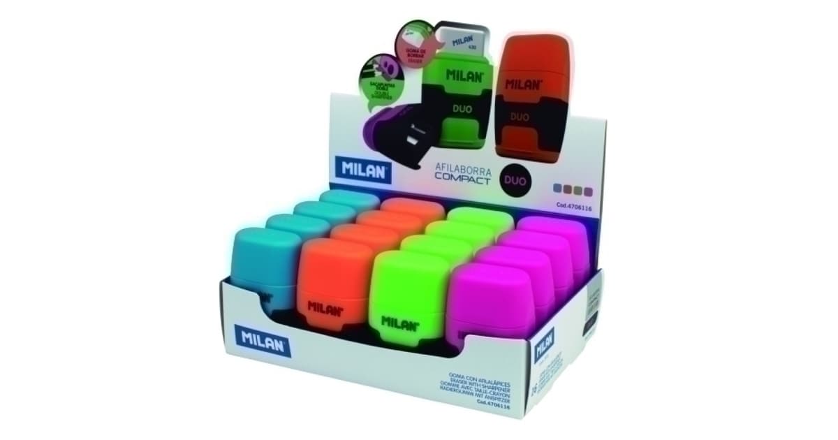 Combinación de goma y sacapuntas en un diseño patentado con tacto de goma de miga de pan agradable al tacto. El sacapuntas doble tiene una cuchilla de acero al carbono afilada y resistente, ideal para lápices de grafito y lápices de color. La goma es de miga de pan, suave, de caucho sintético. Para borrar una amplia gama de lápices de grafito. Con capuchón protector para evitar que se ensucie. Artículo con cuchilla de seguridad, este sistema evita que se pueda separar la cuchilla del cuerpo del sacapuntas. Ideal para uso escolar.