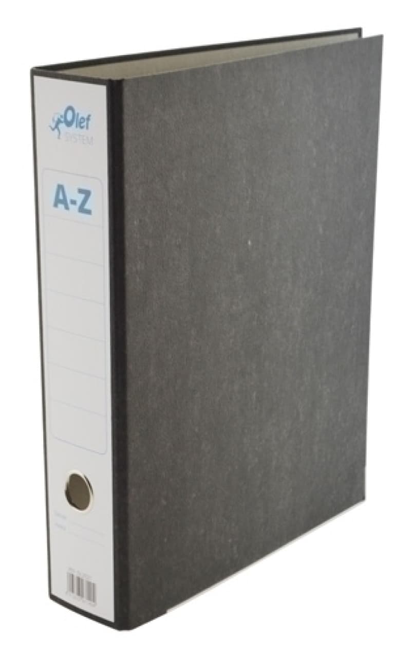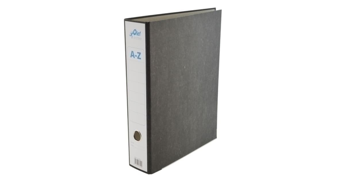 Cartón forrado, interior y exteriormente, con papel impreso reciclable. Mecanismo de palanca niquelado. Cantonera larga. Sin rado. Ollao en el lomo.