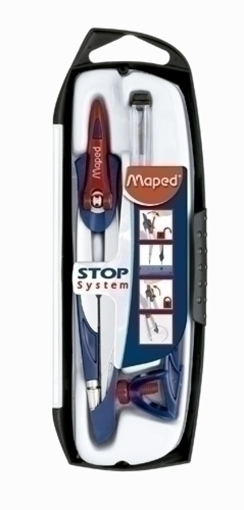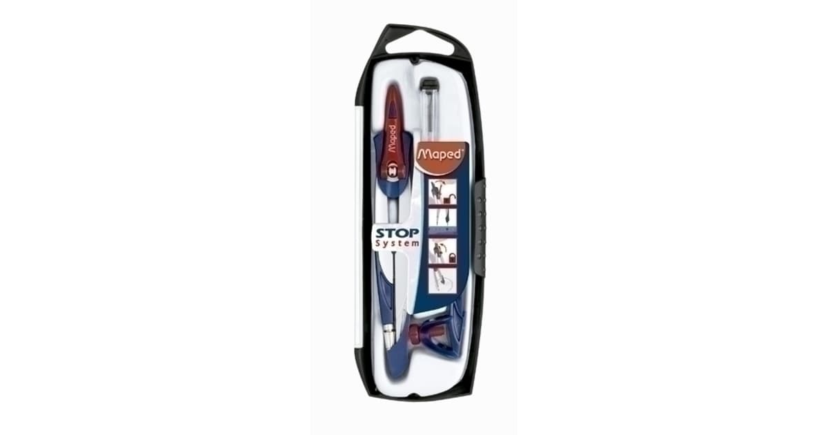 Compás metálico cuyo innovador sistema “Stop System”, permite bloquear fácilmente los brazos garantizando un trazado perfecto. Protector de punta y mina deslizante. Mina de 2 mm. Incluye adaptador universal y estuche de minas.