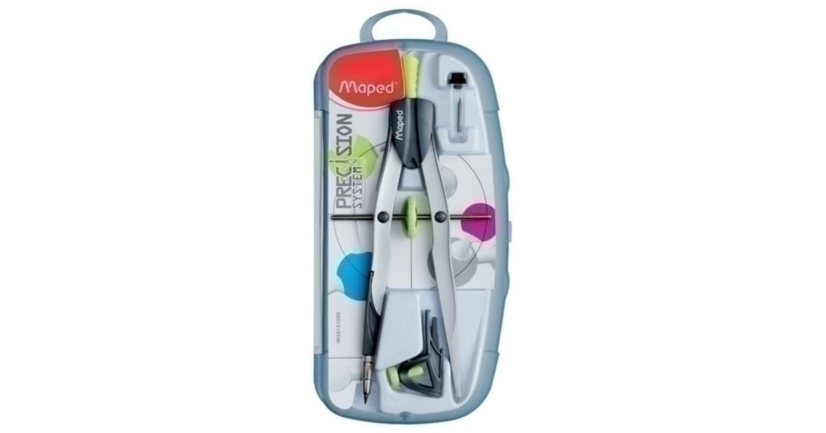 Compás bigotera con sistema de ajuste de precisión. Longitud: 165 mm. Para circunferencias hasta 300 mm. Colores surtidos: azul, verde y fucsia. Se presenta en caja antichoque de 3 piezas: 1 bigotera, 1 abrazadera universal y 1 estuche de minas.