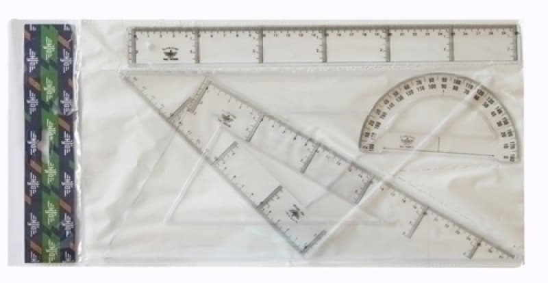 Equipo fabricado en poliestireno inyectado, cristal transparente, con impresión serigráfica color negro. Las reglas y escuadras llevan graduaciones longitudinales y verticales que permiten el trazado de líneas paralelas.