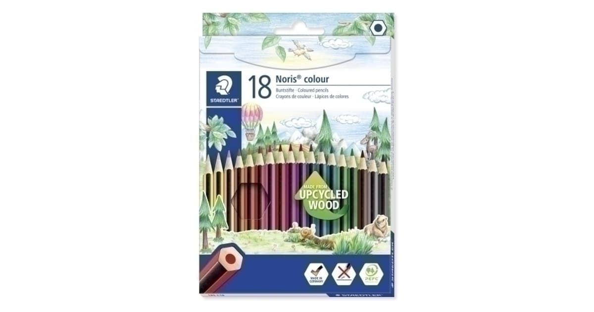 Primer lápiz de color hexagonal fabricado con el innovador material WOPEX. Un diseño tradicional Noris® (rayas negras y del color de la mina) con superficie antideslizante, gran resistencia a la rotura en colores intensos y brillantes. Certificado PEFC.